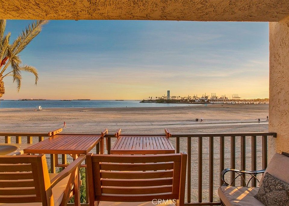 The quintessential beachfront lifestyle. Experience breathtaking ocean and Queen Mary vistas from the comfort of your home. This 2nd level corner unit condo is located in the heart of Long Beach's exciting nightlife, offering views of the pacific ocean with The Queen Mary, Island Grissom and Island White as the backdrop. Step in the front door and you're immediately taken back by the unobstructed views of the ocean. With a modern nautical theme, you're greeted by newer wood-like flooring, tall ceilings and a bright and airy open floor plan. To the right, a well-appointed fully equipped Kitchen including a microwave, dishwasher, stove, and refrigerator. Enjoy your dining at the breakfast bar, dining area or outside on the balcony. Boasting one spacious bedroom with a walk-in closet and an oversize window to take in the ocean views and enjoy the breeze and sounds of crashing waves. Generous sized bathroom with double sink vanity and tile countertop. The spacious living area with a double pane slider brings in an abundance of natural light and leads out to your private balcony where you can relax and take in expansive ocean panoramas! As the sun starts to set your scenery changes as Grissom Island and the Queen Mary light up! Plenty of community amenities such as laundry facilities, a pool, spa, gym, sauna, and a sundeck offering sweeping ocean views. Take the bike path from your unit up to Shoreline Village or down to Bayshore Park. Minutes from the property you can dine at Gaucho Beach, the Queen Mary, 555 and some of SoCal's best dining. Enjoy endless activities from the Terrace Theatre, The Aquarium, Grand Prix, Museum of Arts, and so much more!