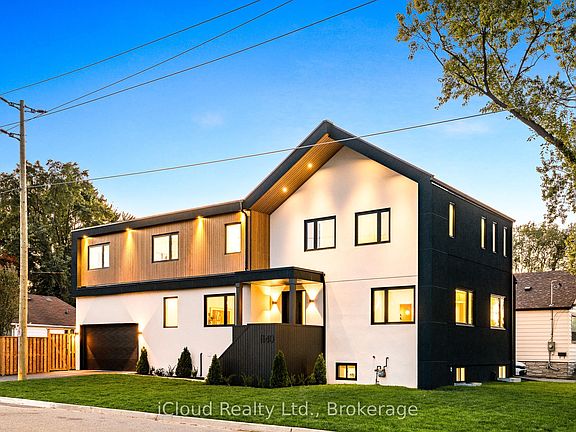 Stunning newly built custom home offering 4+1 bedrooms and 5 bathrooms with nearly 3,800 sq.ft. of luxury living in Mississauga's desirable Lakeview community.Situated on a wide 44x110 corner lot with striking curb appeal,this residence showcases a modern exterior with natural wood siding accents, exterior pot lighting,a full irrigation system with rain sensors, smart perimeter security cameras, and WiFi digital locks.A built-in two-car garage with high-lift doors, mezzanine storage loft, universal EV charger, and a private drive for two more vehicles offer parking for four.Inside, elegant finishes include white oak flooring, designer large-format tiles, pot lights with dimmers, and motion sensor closet lighting throughout.The main floor features an open living and dining area with custom accent wall and sconces, a private office, and a designer powder room with custom mirrors,integrated strip lighting, and wall-hung toilet.The chefs kitchen is a true centerpiece with a quartz waterfall island, full quartz backsplash,WiFi-enabled smart appliances, induction cooktop, wall oven, automatic heat-sensor hoodvent, pot filler, oversized sink with built-in racks, walk-in pantry with custom storage, and a coffee/bar station.A side mudroom with garage access completes the level.Upstairs, the primary retreat boasts two walk-in closets with integrated lighting and a spa-inspired ensuite with radiant heated floors, freestanding tub, wet-room shower, private water closet, wall-mounted faucets, and backlit mirrors.Three additional bedrooms include one with ensuite and walk-in closet, plus a shared bath.The finished lower level offers a large rec room, a bedroom and bathroom, plush carpet, generous storage, and an open-concept layout ideal for a recreation area or future secondary suite. Located minutes from Lake Ontario,Lakefront Promenade Park, Port Credit GO, the QEW, and the exciting Lakeview Village redevelopment, this home blends modern luxury, lifestyle, and long-term value.