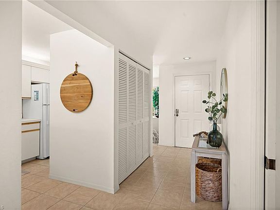 Turnkey 2-bedroom plus den, 2-bath second-floor, end unit condo with 1,370 sq. ft. in Westgate at Imperial Golf Estates. This well-maintained home includes an entryway leading to a den with carpet and furnished with a desk and accent chair, perfect for a home office or flex space. The kitchen offers ample cabinet storage with crown molding, a large pantry, and opens to a dining area highlighted by large windows. The living room features a sectional sofa, accent furnishings, and wide glass sliders that fill the space with natural light and lead to the screened lanai with peaceful lake views. The spacious primary suite includes a bed set with nightstands and dresser, along with an en-suite bath featuring a walk-in shower and linen closet. A guest bedroom with double beds and an additional full bath provide comfort for family or visitors. Luxury vinyl tile flooring extends through the living and dining areas as well as bedrooms, with ceiling fans throughout. Additional conveniences include laundry in residence and one assigned parking spot. Westgate offers a host of amenities including a community pool and spa, fitness center, community room, pickleball, tennis, and golf. Located just minutes from Route 41, I-75, shopping, dining, entertainment, and Naples’ beautiful beaches.