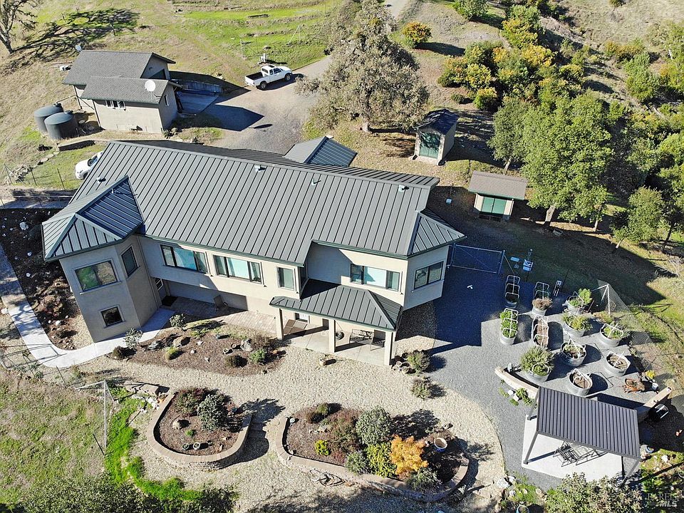 Custom Estate with Panoramic Valley Views. The main level incorporates, hardwood floors, high ceilings and expansive southern views. The kitchen is a chef's dream with two sinks, premium appliances, stone countertops, an island, and raised bar seating, perfect for gatherings. The lower level could serve as a second home or private guest quarters, with a mudroom entry, second bedroom, and full private bath. The finished 1,000 sf. basement could easily be converted into a gym, theater, or recreation room. The property features 2 automatic locked gates, a two-car garage, workshop, 2 storage sheds, and a powerhouse. Adjacent to the existing peaceful surroundings, sits 35 acres of BLM land as well as a fully fenced RV site. Terraced flower gardens filled with native and ornamental plants and a Pergola that overlooks the picturesque Redwood Valley, offering views of vineyards, orchards, and surrounding wildlife. Built for fire safety, efficiency, and peace of mind, the property includes a stucco exterior, metal roof, three fire hydrants, fire sprinklers, security system, backup generator, Solar Power, well, sediment filtration system, rainwater catchment, plus 30,000 gallons of water storage. This one-of-a-kind property combines privacy and sustainability in a truly serene setting.