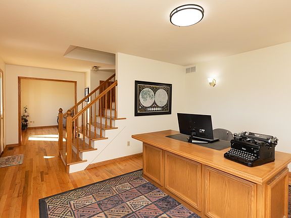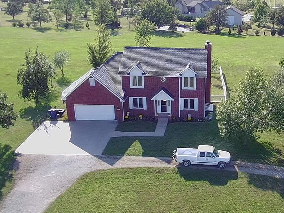 This immaculate, move-in ready brick two-story offers the perfect blend of country living and city convenience. Boasting 5 spacious bedrooms, 3.5 bathrooms, a tandem 3-car garage, and two fireplaces, the home is filled with natural light and features stunning hardwood floors. Upgrades include a high-impact roof, an enhanced septic system, and two high-efficiency HVAC units—separately controlling comfort on the main, upper, and basement levels. Enjoy outdoor fun and relaxation with 5 acres of open space as well as six mature, fruit-bearing trees (including 2 apple, 2 cherry, plum, and pear). The main floor highlights a generous kitchen, formal dining room, main-level laundry, living room, and a dedicated office, all seamlessly connected by beautiful hardwood flooring. Upstairs, discover four oversized bedrooms and a luxurious master suite complete with a separate bath and shower, plus walk-in closets. The partially finished basement provides even more living space, featuring a full bathroom, bedroom, two large open rooms, an additional laundry area, and abundant storage. All of this is set just minutes from Wichita, Derby, and Rose Hill, within the sought-after Rose Hill school district.