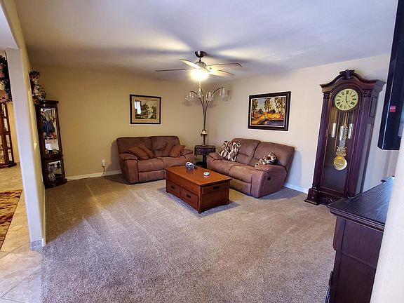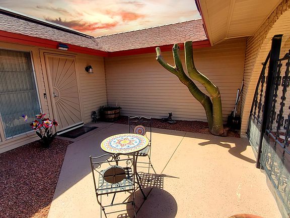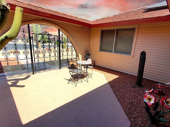Beautiful 4 bedroom (2 master suites - one behind a hidden Murphy door), 2 bath renovated home in Sun City (a retirement community). 6' ft privacy block wall around the large backyard. Fully furnished home: Patio furniture, outdoor dining tables and fruit bearing lemon and orange trees. Quiet cul-de-sac, senior living. The property is fully furnished with everything you will need. From furniture to pots and pans, linens and TVs. Parking: One-car garage with lots of storage!
