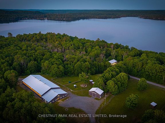 A once-in-a-generation offering on prestigious Boshkung Lake in the Haliburton Highlands, this private estate blends luxury waterfront living with distinguished equestrian amenities. With over 100 acres, 440 feet of deep clean shoreline, and 7000 sq ft of thoughtfully designed space, this exceptional property offers privacy, sophistication, and natural beauty. The custom home features 4 bedrooms, including a show-stopping primary suite with fireplace, soaker tub overlooking the water, an exceptional walk-in closet, and a private deck with sweeping lake views. The elegantly appointed eat-in kitchen is a true centrepiece featuring premium appliances, custom cabinetry, expansive prep surfaces, and a sunlit breakfast area perfect for casual dining. A butlers pantry adds function and flair for effortless entertaining. The kitchen opens to an expansive dining room with additional seating and a striking fireplace, ideal for memorable gatherings. Multiple living areas throughout offer spectacular water views, and walkouts lead to maintenance-free decking that extends living space outdoors. The property features several outdoor lounging, dining, recreation and entertaining areas designed to maximize lakefront serenity and privacy. A media/games room with wet bar, home gym, and generous indoor-outdoor flow enhance year-round living. For the discerning equestrian, the estate includes a 70 x 140 indoor riding arena, multiple paddocks, and well-appointed stalls, providing the infrastructure for year-round riding, training, and care. Private trails wind through the forested acreage ideal for horseback riding, hiking, or peaceful exploration. With a 4-car garage, beautifully landscaped grounds, and complete privacy, this rare waterfront estate unites refined living, outdoor recreation, and timeless elegance in one of Ontarios most coveted lakefront settings.