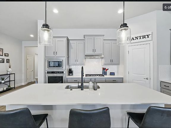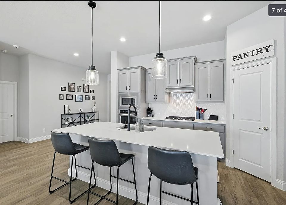 Single-story ranch homeSolid surface countersModern kitchenDecorative lightingLarge kitchen islandWalk-in pantry