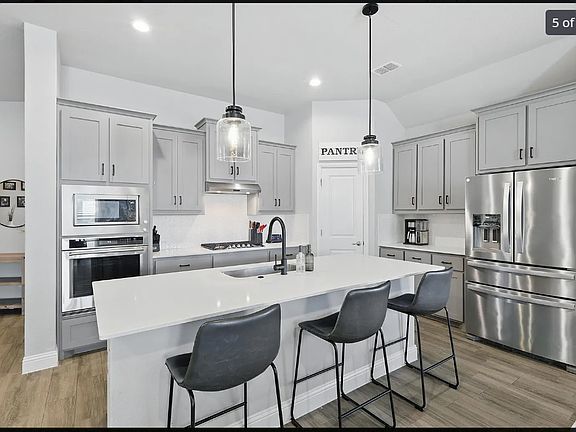 Modern Kitchen: Features a large Kitchen Island, solid surface counters, a Walk-In Pantry, and an open flow to the dining and living areas.