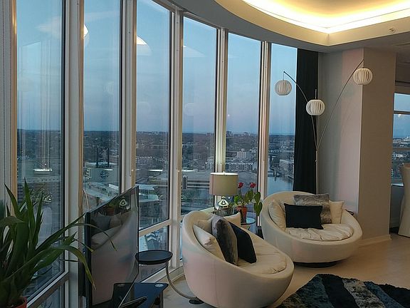 Spectacular panoramic views of the city, river and Fiserv Forum highlight this luxury 1 bedroom condo located on the 28th (secured) floor in The Moderne. The open concept condo features a state of the art kitchen with a breakfast bar, subzero appliances and convection microwave oven, separate dining area and spacious living room, a walk-thru closet to the bathroom and in-unit washer and dryer. Also included is a full-service concierge offering delivery of dry-cleaning and packages. Dog/cat friendly. Rent includes: heated underground parking (1 space), all utilities except electric, fitness center, concierge lounge, secured floor with locked entry with an intercom system and in the heart of the new Fiserv Forum entertainment. Tenant pays electric /internet / cable