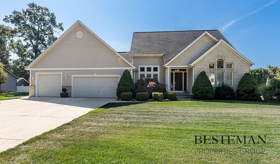 Well-built 2-story in a desirable neighborhood of Reeths-Puffer School Dist. ready for new owners! Enter on the gorgeous wood floors from the impressive dining area to the marvelous living room with vaulted ceiling & gas log fireplace. The kitchen features solid surface Corian counters, snack bar, stainless appliances, & walk-in pantry. Main floor also features a primary bedroom w/ spacious & private ensuite, main floor laundry room, guest half bathroom, & custom covered back deck. Views at the second floor custom balcony are perfect for holidays when waking from either of the two sizable bedrooms w/ walk-in closets & 2nd full bathroom. Need more space? Head to the full basement with another living/family room w/ 2nd cozy fireplace, 3rd full bathroom, large office, or re-open the former salon room and enter/exit directly into the 3-car attached, insulated garage (w/ gas line & vent for heater & a generator plug). New 2025 roof, furnace, & A/C! Call today for your private showing!