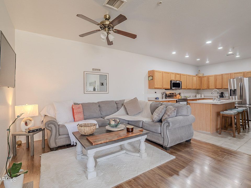 Location, Location! Charming 3-bed, 2-bath corner-unit townhome in the desirable Cottonwood Square—just steps from the park, clubhouse, and pool. Features a split floor plan, open living/dining area, and a private covered patio. The spacious kitchen includes stainless appliances, island, and breakfast bar. Primary suite offers mature trees for privacy and a walk-in jacuzzi tub; second bedroom showcases Mingus Mountain views. Accessibility highlights include ramp entry, wide doorways, and a walk-in tub. 2-car garage with built-in shelving. HOA includes front yard maintenance, irrigation and garbage pickup, plus a recently renovated community pool. Centrally located with easy access to shopping, dining, and all the Verde Valley has to offer.