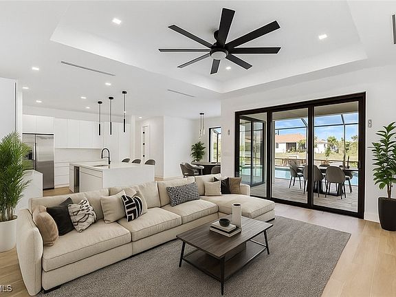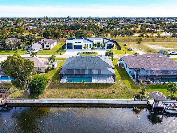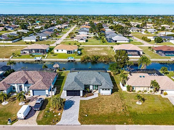 2025 NEW CONSTRUCTION ON THE CANAL WITH CITY WATER AND SEWER. Be the first to live in this stunning, brand-new 4-bedroom, 2.5-bathroom home, perfectly situated on canal in the best neighborhood of Cape Coral. Step inside to a bright, open-concept layout with soaring ceilings, abundant natural light, wood floors, and high-end finishes throughout. The kitchen is the heart of the home, featuring stainless steel appliances, quartz countertops, and a spacious island—ideal for entertaining. The primary suite is your private retreat with a freestanding soaking tub, double rainfall shower, and his-and-hers vanities. Outdoors, enjoy your own personal oasis with a screened porch, beach-entry pool, jacuzzi, built-in BBQ area, and a massive yard with endless potential. Additional highlights include a 2-car garage, impact windows, and irrigation system. All within walking distance to schools, plazas, dining, gyms, and shops: this home offers the perfect blend of luxury and convenience in a growing community.
