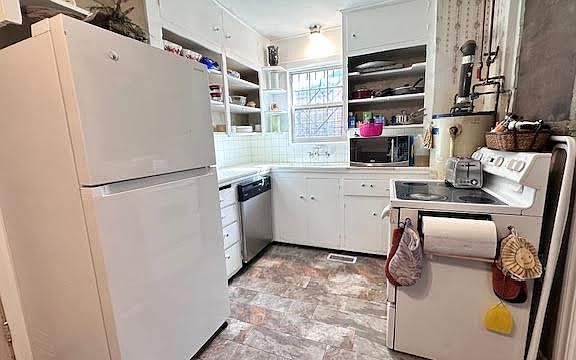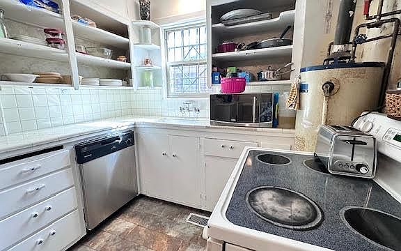 The kitchen offers ample storage, a window over the sink, space for a breakfast nook, and convenient washer/dryer connections. Upstairs, you’ll discover two generously sized bedrooms, both with a cozy reading nook, and several doors throughout the home adorned with vintage crystal knobs. The primary bedroom is especially large, featuring plenty of windows and a roomy closet.