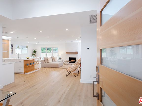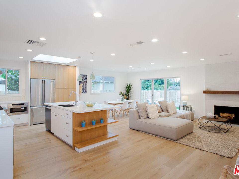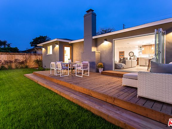 With natural light streaming in from multiple skylights, this freshly renovated Mar Vista Mid-Century is a gem to be discovered! The freshly manicured front yard invites you inside, where you'll discover a bright, open floor plan with wide-planked French Oak floors. The living room centers around the beautiful fireplace with mantle and accordion doors that create the indoor/outdoor atmosphere ideal for summer evening alfresco dining. The chef's kitchen has custom oak cabinetry, large skylight, stainless steel Viking appliances, and a breakfast bar for on-the-go breakfast meals. You'll love retiring to your master suite, including the spa-like master bath featuring natural marble shower, soaking tub under the skylight, and dual vanity sinks. Three generous guest bedrooms and side-by-side laundry area complete the home. Outside, the backyard deck is just waiting for summer barbecue weekends, while the grass area is great for playing catch. In the heart of Mar Vista, this gem has it all!