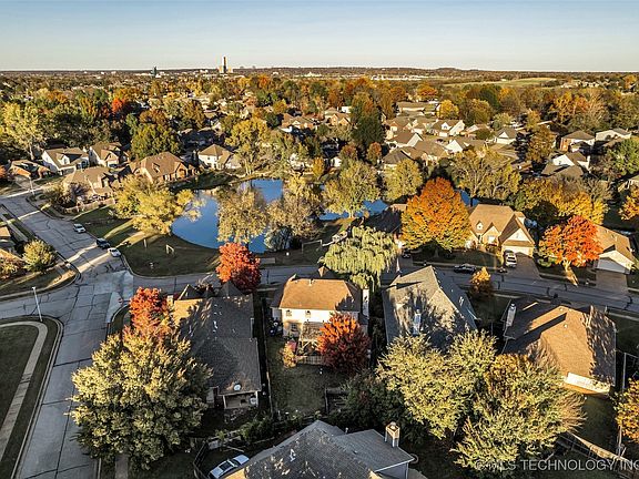 Great location in peaceful Copperfield Estates across the street from the neighborhood pond. Enjoy your morning coffee, latte or mimosa from your front porch with the view of the pond and feed the neighborhood ducks. With the kitchen, dining and living area all open with 12 foot ceilings, fireplace and natural light this home offers a great floor plan to host gatherings and holiday feasts! Boasting a spacious kitchen with pantry, breakfast bar and window overlooking your lovely backyard. Also downstairs is a private office and half bath. The master bedroom offers plenty of space for your king size furniture, a large walk in closet and a very gracious master bath with whirlpool tub, separate shower, large vanity with double sinks. Upstairs also offers a large landing for that relaxing area to read, relax or play. In your backyard you can enjoy your patio with pergola and plenty of nature with the bird friendly trees and bushes. The home is priced to allow for updates and some freshening up. Great price for a home in the Jenks area and school district.