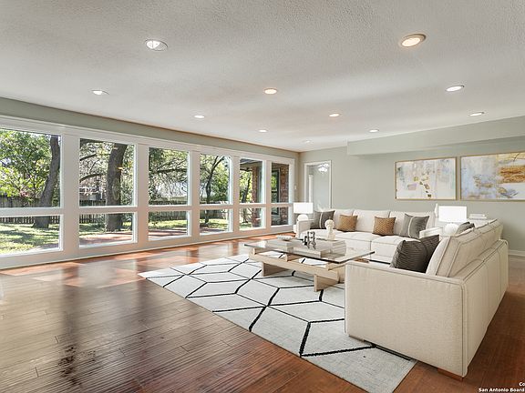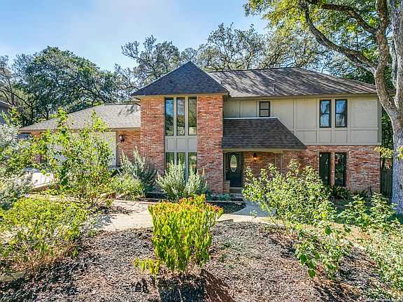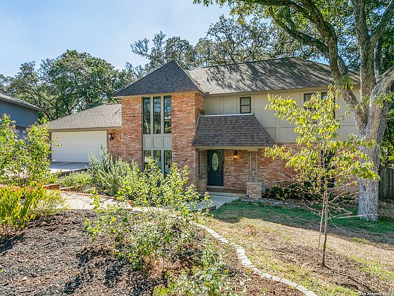 This beautifully maintained comfortable and spacious home offers character and convenience in a community-rich neighborhood. Step into a spacious living room with recessed lighting, engineered wood floors, and a wall of windows overlooking a serene backyard with mature oak trees, a pergola, and a brick paver patio. The two-story front windows illuminate a cozy nook tucked under the curved staircase-perfect for reading, playtime, or a plant haven. No carpet downstairs, with tile and engineered wood throughout. The kitchen features trendy green cabinetry, stainless steel appliances, and opens to both a breakfast area and a flexible formal dining space that can double as a home office. The oversized owner's suite boasts cathedral ceilings and a wall of windows with backyard views. The fully renovated 2023 ensuite bath includes a double vanity and a walk-in shower with rain head, spray wand, bench, product alcove, window, frameless glass, and stylish tilework. Generously sized secondary bedrooms and a well-designed hall bath with double vanity and privacy door make mornings easy. The oversized garage fits Texas-sized trucks and offers bonus storage. Located steps from the community playground, this home is part of a friendly neighborhood with voluntary HOA and optional swim, tennis, and garden clubs. Enjoy small-town charm with events like Easter egg hunts and 4th of July bike parades-all while being centrally located near everything San Antonio has to offer. Recent updates include roof & water heater (2016) and upstairs HVAC (2020).