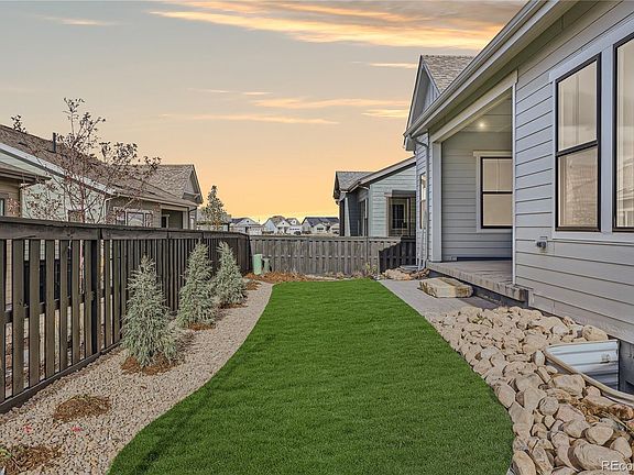 Beautiful single story home located in the desirable Solstice Community by Shea Homes. Solstice is surrounded by Chatfield State Park on 3 sides of the community and acreage parcels on the 4th side. This home features 4 bedrooms, 4.5 baths, 3-bay garage, fireplace, finished basement with wet bar, large covered back patio, backyard landscaping and backyard fence.  Design finishes include luxury plank Shaw Supino Giardino wood-style flooring and stairs, tile floors at the bath and laundry rooms, MSI New Carrara Marmi quartz kitchen counters with full backsplash, 12x24 AZT Themar Bianco Lasa polished full height tile fireplace surround, and MasterCraft Marion Maple Smoke cabinets. The Mirabelle Metropolitan Districts provide various services to the property and in addition to the estimated taxes, a $40 per month operations fee is imposed.