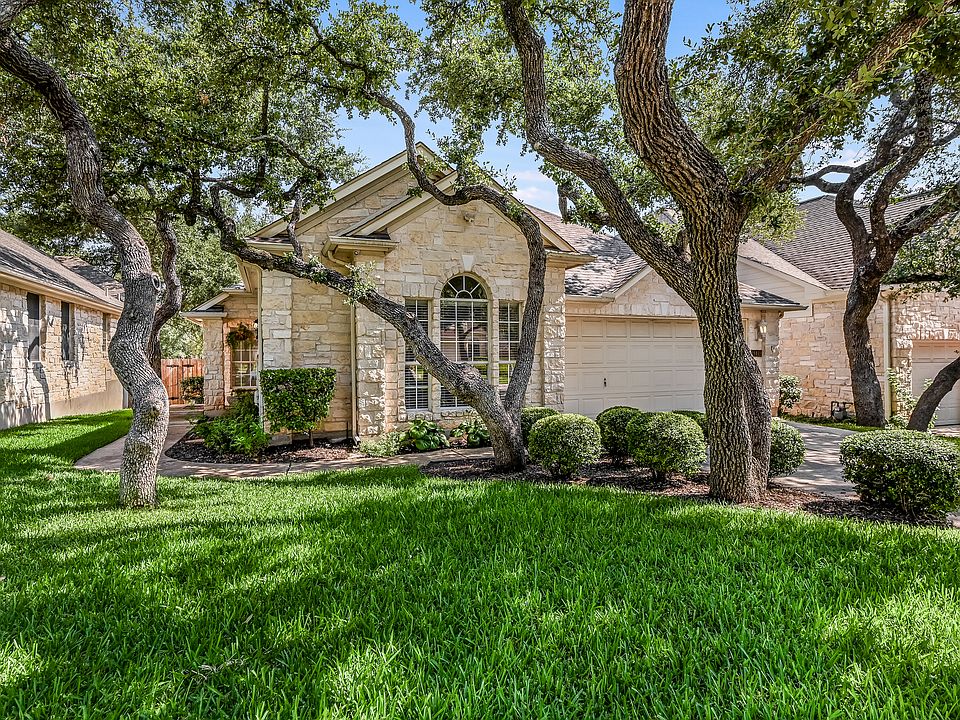Walk through the doors of this white Texas Limestone single story, side entry home with high ceilings, crown molding, wide plank hardwood floors, ceramic title and beautiful details immediately greet you. The home features large picture windows, wood blinds and built ins. In the Texas winter ‘cozy up on the couch with a ‘soft throw and a gas log (also wood burning) fireplace in the oversized family room.