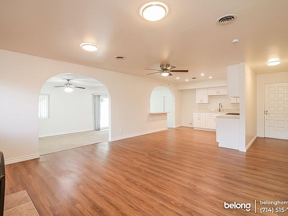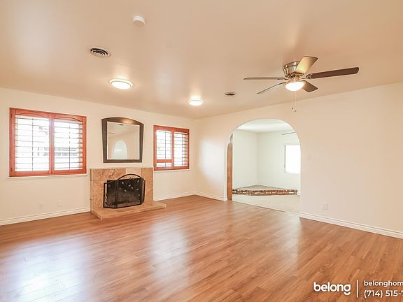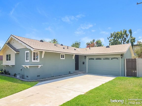 This beautifully-upgraded home is as practical as it is impressive, with a versatile layout, a spacious driveway, a 2-car garage, and a separate family room that all provide the perfect space for when you have guests over! The kitchen is brand new and showcases a range of features including granite counters and white shaker-style cabinets with silver hardware that beautifully matches its brand new stainless steel appliances! Gorgeous wood-inspired laminate floors add a warm ambience inside the home while arched entrances to the family room provide an open and spacious vibe. From the family room, you can head out of the the glass doors to find an amazing covered patio and garden that is airy and perfect for hanging out with friends and family on hot summer days. It is adorned by flowering shrubs, trees, and verdant lawn! Automatic sprinklers are installed in the back and front yards to help keep the grass healthy. On the left side of the home you will find three bedrooms presented to an excellent standard with ceiling fans and ample natural light. The main bedroom has its own ensuite bath, while the two secondary rooms share a hallway bathroom. This home is centrally located in Stanton, close to parks, shopping, freeways, schools, Disneyland, Knott's Berry Farm, and more! Come see this gem before it is gone! Fireplace is for decorative use only and cannot be used without consent from Belong.