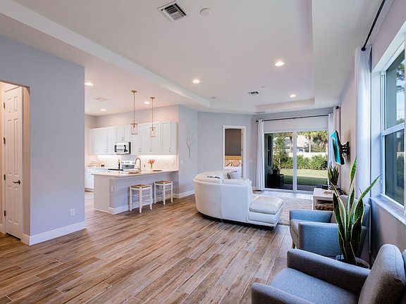WELCOME HOME! This beautifully appointed 'Arezzo' plan with modern finishes lies within a fully guarded, gated community and boasts a fresh layout concept. This meticulously and gently lived in 3BR/2BA/2CG home has the best of both worlds, with a private back yard and lake views from the main entrance. Exquisite tile flows throughout the home, and carpet softens and accentuates the bedrooms that encompass natural light. The well designed and kitchen boasts white cabinetry, quartz counter tops, ss appliances and a bar counter-top. The owner's oasis overlooks the back yard and with its tray ceilings, dual closets, and spa like ensuite - leaving it hard to imagine life outside. Each bedroom is equipped with its own hard-wired internet. Step outside to an enticing community resort-inspired amenities including a 27-court Pickleball Complex, and golf cart access to 54 holes of PGA Golf Club. Club Talavera is the social and recreation center of the community, complete with Fitness Center; Yoga and Aerobics Studio; tennis courts; basketball; bocce; Resort-style Pool; and Indoor Pool with spa that is all overseen by a Full-time Lifestyle Director and Activities Teams. Upscale dining, shopping, and entertainment are all easily accessible. Don't miss an opportunity to be a part of this awe-inspiring community.