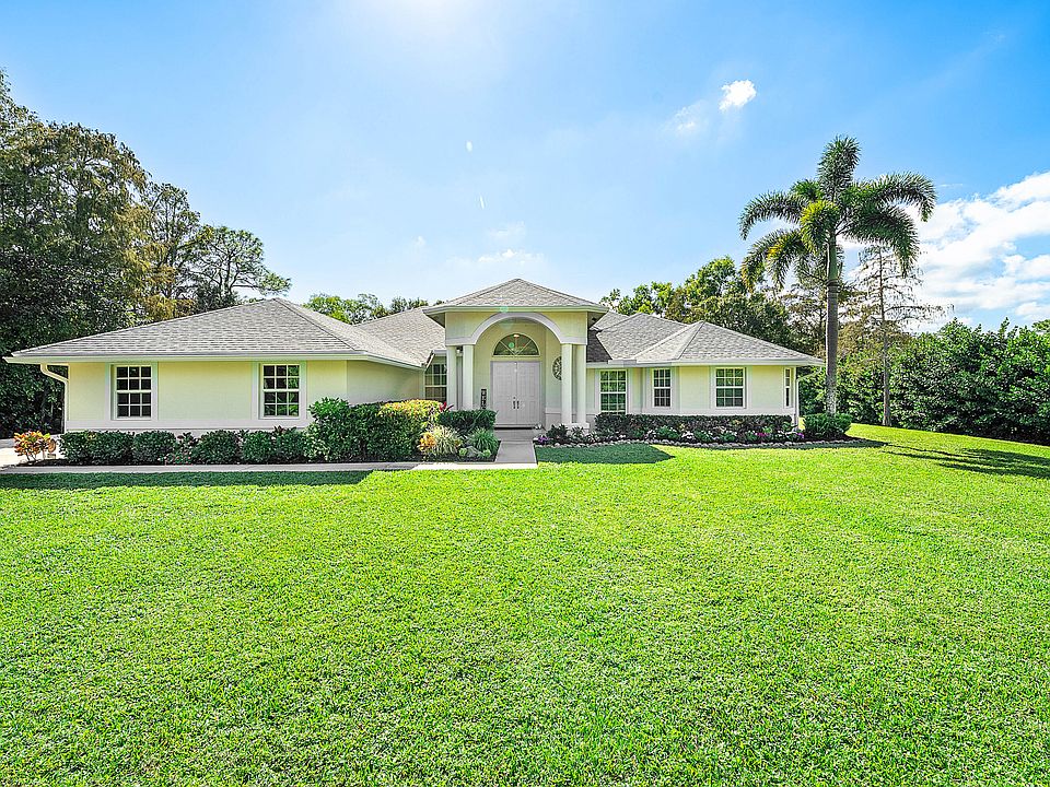 Your Jupiter Farms Dream Home Awaits!This stunning five-bedroom, three-bathroom, three-car garage home sits on a high and dry 1.25-acre lot and offers the perfect blend of comfort, functionality, and luxury. The triple-split floor plan is ideal for guests or multi-generational living.Enter through double doors into a spacious foyer featuring high ceilings, crown molding, and diagonal tile flooring that flows through the main living areas. The formal dining and living rooms lead into a large open-concept kitchen and family room, perfect for entertaining and everyday living.Four sets of sliding glass doors open to the screened-in saltwater pool and spa, complete with a waterfall feature, covered lanai, stone pavers, and outdoor shower--your private outdoor oasis. The primary suite is a true retreat, showcasing a tray ceiling, pool views and access, and a luxurious bathroom with dual vanities, a soaking tub, a walk-through sport shower, two closets, and a jewelry closet.