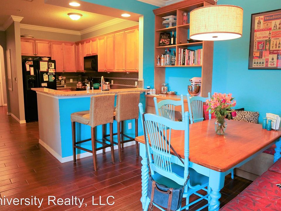 BEAUTIFULLY decorated plus lots of UPGRADES, one-of-a-kind 3 bedroom condo near Sorority Row. Enjoy walking distance to UF campus and UF Shands Hospital in a fully-furnished top floor condo in highly sought-after Campus View North. Each bedroom has its own bathroom, large closet, and chocolate brown plush carpet. The upgraded kitchen boasts granite counter tops, custom backsplash, and built-in dry bar. The dining room has a custom built-in banquette that seats 8 with extra storage underneath, plus there's 2 bar stools for casual dining. The open concept living room and dining room have 9' ceilings, crown molding, fun custom wall paint, as well as ceramic tile flooring looking like espresso stained wood but far easier to care for. Each room is furnished for style, comfort, and a desk for studying. There's even custom seating on the balcony. All appliances included, plus your own private laundry room. You won't find anything like this in Gainesville. This 4th floor unit, in one of the few elevator buildings, is owner occupied and will be vacated on May 1, 2017, at which time it becomes available for a new owner.