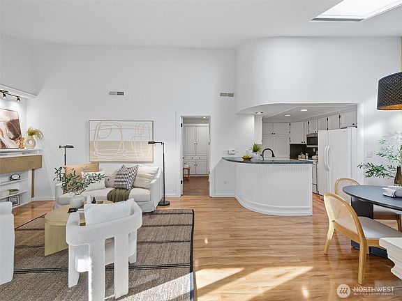 Welcome to your peaceful 2-bedroom retreat in Totem Lake! This inviting top floor condo features 12 ft vaulted ceilings that complement the open living and dining space with stylish kitchen. This corner unit gets natural light year-round with south and west facing windows and skylights. Relax by the wood-burning fireplace or enjoy the large private deck. 2 spacious bedrooms provide ample closet space, with a spa-like bath. Well managed HOA with no rental cap. Includes in-unit laundry, carport parking with additional storage, plus an outdoor pool with hot tub. Ideally located walking distance to Totem Lake Village with easy access to I-405, transit, parks, shopping and dining. Near downtown Kirkland, Evergreen Hospital and Tech campuses.