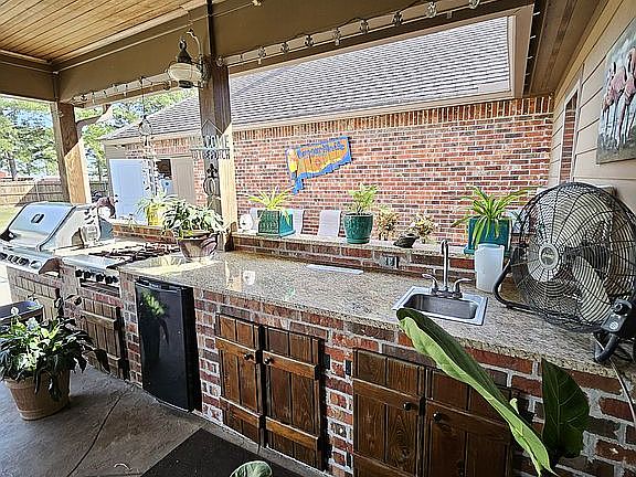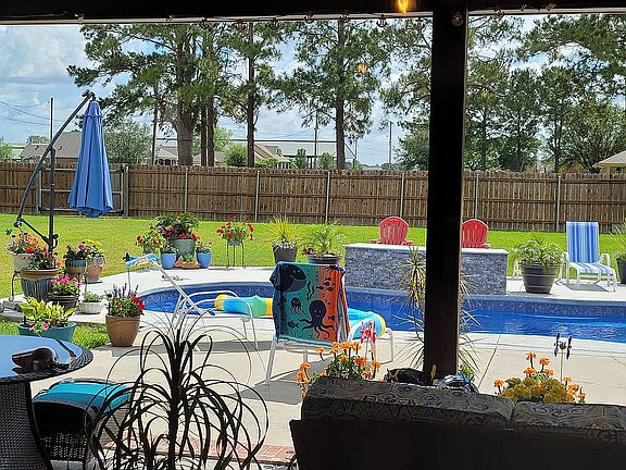 Out back, enjoy an entertainer's dream: a covered patio with outdoor kitchen, complete with gas grill, sink, fireplace, and cement overlay floors. Take a dip in the 26-ft sapphire blue Riviera saltwater pool, featuring a heater, cooler, and waterfall—perfect for hot Louisiana days or cool evenings under the stars.