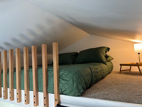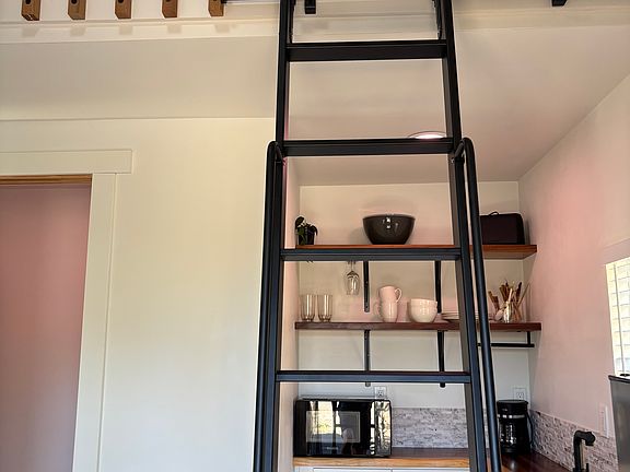 Our space may be small, but it's bright, thoughtfully designed, and incredibly comfortable. In the loft, you'll find a full-size bed and four storage bins, all accessible by ladder.