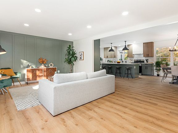 Stone fireplaceStylish finishesContemporary abodeMature landscapingMassive islandBreathtaking nature viewsLuxurious primary suite