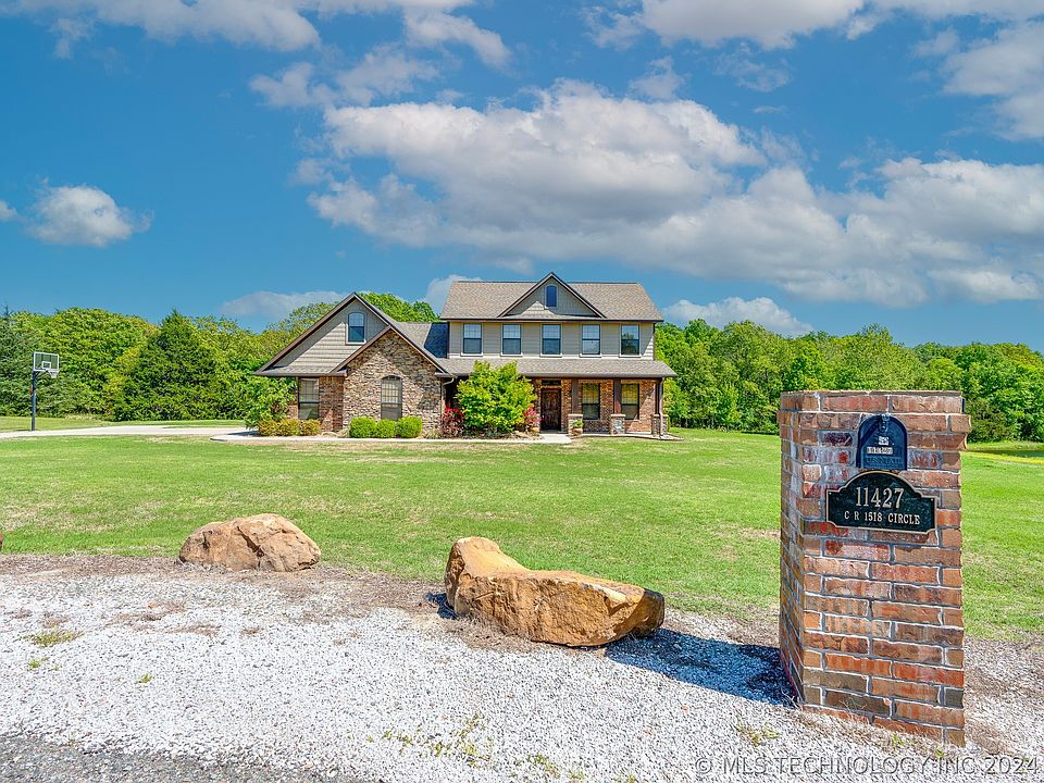 This lovely home is situated on 2.30 acres and has a pond with deck for fishing or just relaxing in the evening. Open concept, formal dining, fireplace, study, powder room and mudroom. Primary bedroom suite downstairs. Large laundry room with front loading washer & dryer. Upstairs boasts 4 bedrooms, family room, 2 Jack & Jill bathrooms. 3 car garage and hidden behind the cedar trees is a cozy sitting area with dry creek bed & firepit. Storm shelter in garage floor. So many amenities!