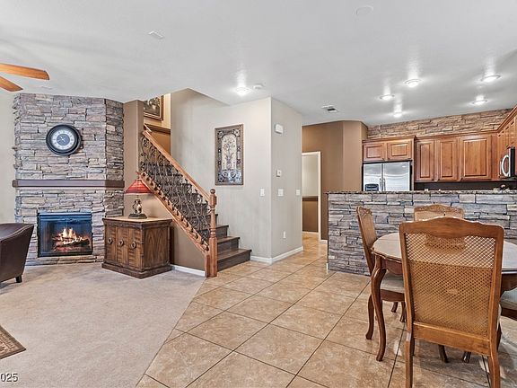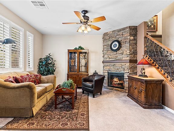 A townhouse in desirable Summerlin South in mint condition! The open living area features a stone fireplace, perfect for relaxing evenings. The kitchen is beautifully appointed with custom cabinets, granite countertops, stainless steel appliances, lg walk-in pantry, and stone surroundings. The second level features the first primary bedroom with en suite bath featuring double vanity, granite counters, separate tub/shower, and large walk-in closet, 2 nice size secondary bedrooms and a versatile den or 5th bedroom! The third level is a second primary with en suite bath and a large walk in closet. This gem is near the community amenities which includes a pool, jacuzzi, park, covered grilling and picnic area, kiddie pool, and playground equipment. The home is a quiet end unit with a 2 car garage w/ epoxy flooring and a water softener. Shows like a model home!