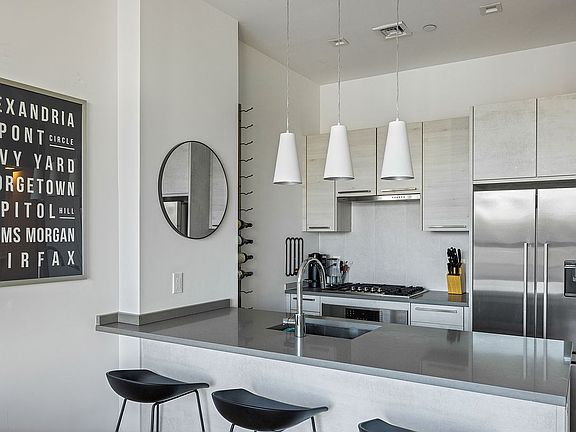 The kitchen boasts an eat-in peninsula, sleek stone countertops, custom cabinetry, and high-end stainless steel appliances including a dishwasher, gas cooktop, and double-door fridge.