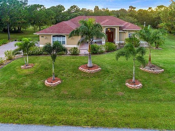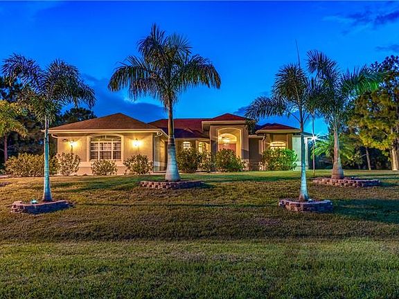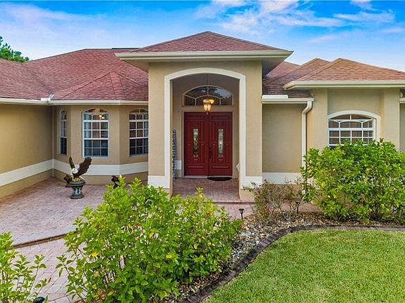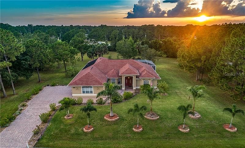 Looking for an elegant estate home with entertaining and privacy in mind? Your guests will be envious of this meticulously maintained home! Its custom design is meant to appreciate the beauty and privacy this home offers. Grand foyer entry, tray ceilings, crown molding. Large windows and sliders accentuate the spectacular view of the saltwater solar heated pool and landscape. The sunsets with the view of the park like open acreage will never get old. Full sliders expand the living space allowing access from the living room to the spacious lanai. Ceramic tile flooring in the living room, dining room, family room and kitchen compliment nicely with the master suite wood flooring. You will love the spacious master suite with tray ceiling, crown molding, sliders accessing pool, separate en-suite bath, double sink vanities, soaking tub, walk-in shower. The open well equipped kitchen has cherry cabinets, reverse osmosis filtration in kitchen, stainless appliances, solid surface counter tops, and island with another sink and food prep area, walk in pantry closet. Dinette area with aquarium dining windows with view to the pool. The 2 split design guest bedrooms are private with easy access to the guest bathroom. The 3rd full bath accesses the lanai, pool area, and family room. Dual zone A/C allows master suite separate comfort settings. A full size laundry room with cupboards, utility sink. The yard is beautifully landscaped including royal palm trees and irrigation. A large brick paver lanai patio, fenced back yard with newly installed 4 foot high aluminum fencing. Large garage with separate custom storage area. Oversize stone paver driveway & entrance walkway. This home awaits your quiet romantic evenings. Home is centrally located near golf, beaches, baseball spring training & all of the area's amenities. Newly installed water filtration system (2019). Adjoining back .9 acreage (Ac#1117239110) is cleared, landscaped & available for purchase with separate contract.