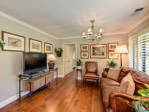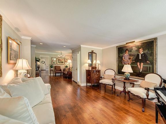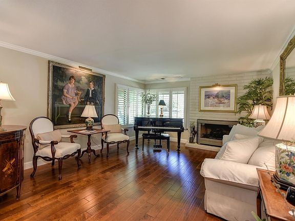 A gorgeous, immaculate, updated single-story home with Professional Interior Designer Touches throughout. Elegant engineered hardwood flooring, decorative crown molding, baseboards & plantation shutters. The chef's kitchen has stainless steel double ovens & dishwasher, a built-in refrigerator and large kitchen window overlooking one of the 2 delightful patios. The gated courtyard entry has an enchanting private magical patio. Newer roof & HVAC, over $75,000 in remodeling & upgrades.