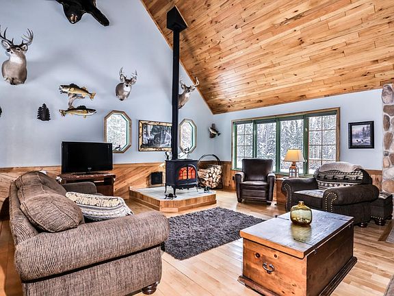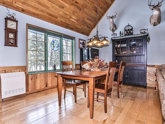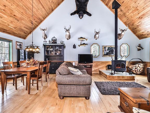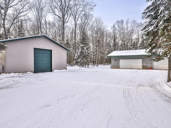 Welcome home to this beautiful Chalet in the Woods! Over 5 acres of land with trails through the property, including 2 deer stands! Huge newer pole building with extra tall door for RV's, 3 plus car insulated garage with lean-too storage behind. Main level living with large primary bedroom, laundry, spacious open kitchen with newer appliances. Gorgeous great room with wood cathedral ceilings and wood burner. Second level open loft - second bedroom - is huge_ bring your ideas. Currently used as a bedroom and home office. Fiber Optics has been installed! Full unfinished basement for tons of storage or additional living space. Right on the fantastic Vilas County paved bike trail and snowmobile trail!