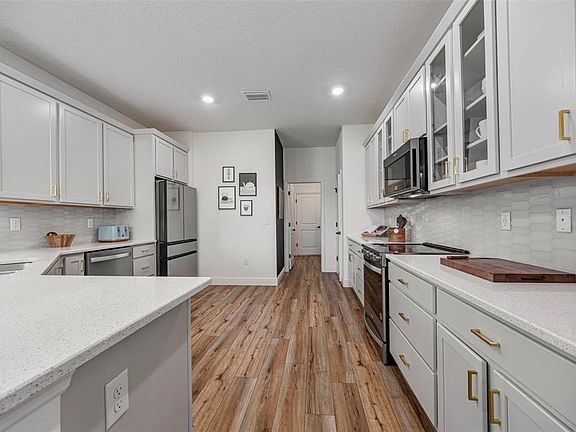Two-car garagePlush carpetingBar seatingSpacious kitchenRich wood-like lvp flooringModern backsplashStone countertops