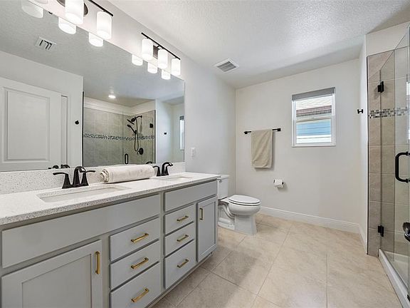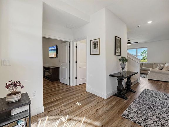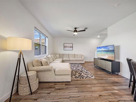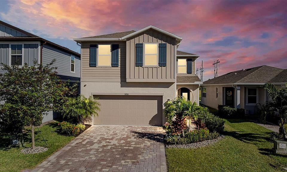 Step into modern comfort and style with this stunning two-story, 5-bedroom, 2.5-bathroom home offering over 2,500 sq. ft. of living space. Built in 2023, this home perfectly blends contemporary design with everyday functionality, all set in the sought-after North River Ranch community. From the moment you arrive, you’ll be impressed by the home’s beautiful curb appeal — featuring a paved driveway, charming blue shutters, and lush landscaping accented by mature palm trees. Inside, the rich wood-like LVP flooring on the first level creates a warm and inviting atmosphere, while the second floor features plush carpeting for added comfort. The first floor boasts a large bedroom which can be used as a "flexible space" such as a home office, bedroom, home gym or playroom. This floor also includes an open living and dining area with direct access to the screened-in, paved patio — perfect for relaxing or entertaining. The spacious kitchen is a chef’s dream, featuring stone countertops, a modern backsplash, bar seating, and stainless steel appliances. You’ll also find a convenient laundry room and two-car garage on this level. Upstairs, unwind in the large family room/loft, perfect for movie nights or a play area. The primary suite offers a walk-in closet and a luxurious en suite bathroom complete with dual sinks and a modern glass-enclosed shower. Three additional bedrooms, each with their own walk-in closet, and a full bathroom complete the upper floor. This community has everything you need! Enjoy resort-style living with low HOA fees and incredible community amenities, including 3 resort style pools, clubhouse, fitness center, dog park, walking trails, and playgrounds. With a vibrant social calendar and tons of community events you will experience community living at its best. Conveniently located just minutes from top-rated schools such as Barbara A. Harvey K-8, with their brand-new upper Campus right in the community and Parrish Community High School! Minutes from the recently opened HCA Florida North River Ranch Emergency and Market Walk with access to coffee shops, dining options, Publix Super Market, dentists and more! Easy access to I-75 and Highway 301. Only a short drive to the city of Tampa, St. Petersburg, Sarasota, and the beautiful Gulf Coast beaches. Welcome to your new home in North River Ranch!