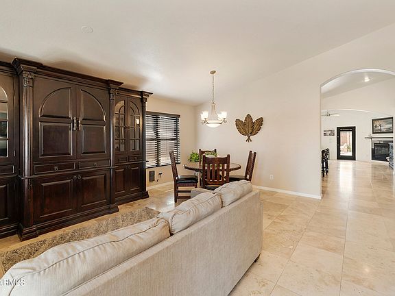 Beautiful upgraded home with vaulted ceilings. 3 bedrooms plus an office, 2 baths, 2 car garage, and Pebble Tec pool. Easy to care for travertine tile throughout, LVP in bedrooms and office. The great room, with fireplace incorporates an expansive kitchen island for gathering, seating eight. Upgraded kitchen cabinets with a separate coffee bar with beverage fridge and walk-in pantry are great additions to the kitchen. Entertain at the pool with a gracious patio area and inviting fireplace. Watch the game on the Amazon TV on patio with Firestick. Fresh paint. Whole house water filtration system, some new ceiling fans. Gas is available at stove. New water heater. Third space pad parking. Great neighborhood and just down from the community park and green space.