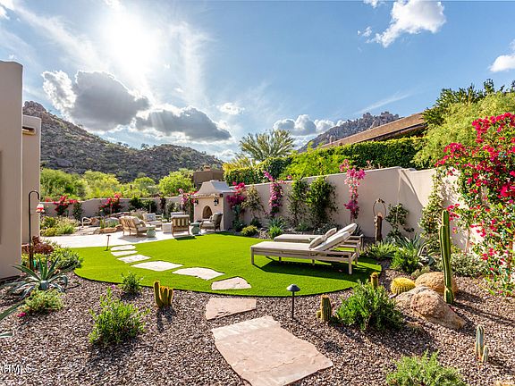 Step outside to a private sanctuary designed for both relaxation and entertaining. An expansive covered travertine patio, 8-person waterfall spa, exterior fireplace, and built-in barbecue create a resort-inspired setting, framed by lush professional landscaping, fruit trees, and a historic 1800s Spanish fountain. Collapsing glass doors open the interior to the outdoors, embracing Arizona's most spectacular sunsets and mountain vistas.