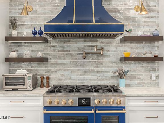 From the moment you enter, you are greeted with sweeping views of Troon Mountain, the McDowell Mountains, and Tom's Thumb, framed beautifully through every window. Wide plank French-milled wood floors, soaring beamed ceilings, and curated antiques — including an 1800s French marble fireplace mantle and a Murano chandelier — infuse the interiors with history, artistry, and authenticity. The chef's kitchen is equally inspired, featuring Blue Star and Sub-Zero appliances, custom cabinetry, marble counters, and a designer pantry, making it both a showpiece and a space for culinary creativity.