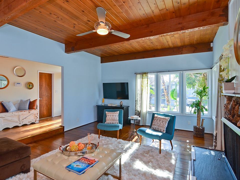 Beautiful Four Bedroom + Studio home. Warm & inviting spacious living room filled w/ character touches such as wood beam ceilings, hardwood floors and decorative fireplace. The cheerful kitchen with an abundance of cabinetry and counters flows seamlessly into open dining area & outdoor patio, all ideal for entertaining family & friends. Four generous bedrooms peacefully tucked away from the common areas. Large master suite features high ceiling, 2 glass door closets and En-suite Bathroom. Versatile Studio / Bonus room w/ bath, ideal as Music studio or Guest suite. Work on hobbies or weekend projects in the oversized two car garage complete with workbench and abundance of storage! Enjoy fresh tomatoes and peppers in the enchanting rear yard or relax in the hot tub after a long day. This home offers a serene setting in a prime neighborhood, close to Farmers Market, Mar Vista park, shopping & eateries. Come see this Spectacular Home!
