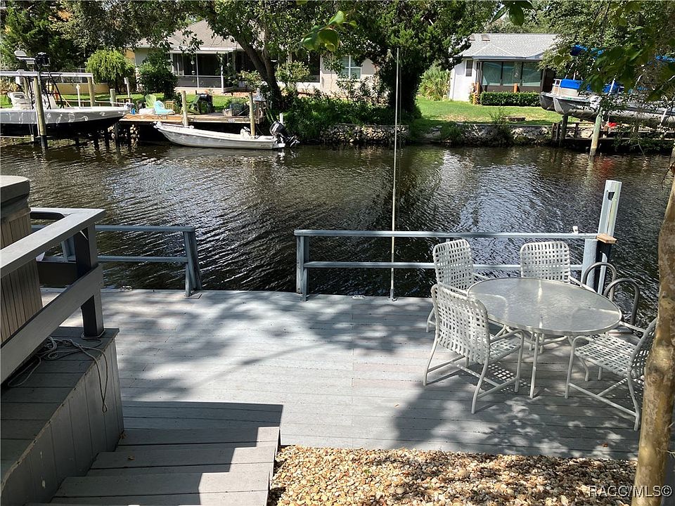 VILLA, 2/2/2 with a DEN or Study and 1500sf, on the CANAL has been FULLY RENOVATED in RIVERHAVEN VILLAGE. The property has a CANAL VIEW with a LARGE COMPOSITE DECK and HOT TUB overlooking the CANAL. Villa FEATURES, a GREAT ROOM, DINING ROOM, PRIMARY and GUEST BR's, DEN or STUDY, two FULL BA's, KITCHEN, enclosed SIDE FOYER PORCH, enclosed LANAI and 2-CAR ATTACHED GARAGE. Primary BR has FULL ENSUITE BA with GLASS enclosed WALK-IN SHOWER. 2nd FULL BA has COMBO TUB/SHOWER. Both BA's have NEW VANITIES with GRANITE COUNTERS. ENTIRE Villa has LUXURY VINYL PLANK throughout. KITCHEN has new GRANITE COUNTERS and STAINLESS STEEL APPLIANCES. The FOYER and LANAI have NEW TILE. DOORS are NEW with much of the DRYWALL replaced and all INSIDE WALLS re-painted. HVAC system is NEW with the HEAT PUMP being RAISED 4 feet OFF the ground. COMPOSITE DECK is SET UP as a BOAT DOCK with GULF a short ride through the CANAL/RIVER. OVERALL a BEAUTIFUL place to call HOME or a WONDERFUL 2nd HOME with WATER AMENITIES.