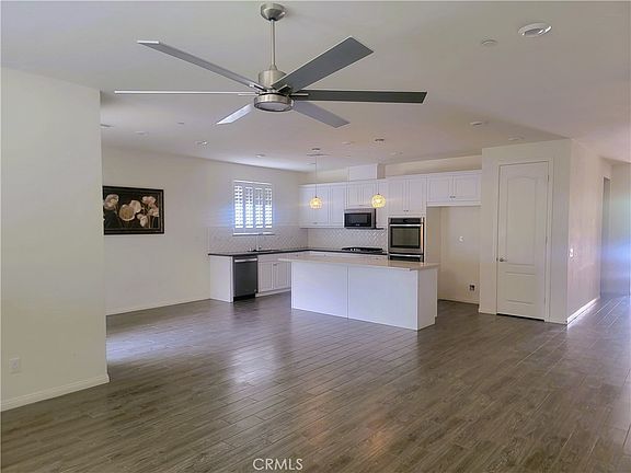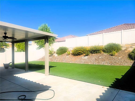Located in a tucked away cul-de-sac in the Cherry Blossom neighborhood of FAIRWAY CANYON. This light and bright 4 bedroom 2 bath home is the one you have been waiting for. Walking distance to the clubhouse and pool. PAID OFF SOLAR! Turf in front and back yards for the ultimate in easy care. Home has an open floor plan with the kitchen opening into the family room and dining room. The kitchen is bright white with quartz counter tops, white tile back splash and a kitchen island highlighted by trendy pendant lighting and breakfast bar seating. Stainless steel appliances which include a double oven, cooktop, dishwasher and microwave. Family room is characterized by a massive ceiling fan reminiscent of an airplane propeller. Shuttered windows and sliding glass door round out the features in the living spaces. Positioned at the front of the home you will find 3 bedrooms and strategically located at the back of the house is the primary bedroom suite that's separated from the other bedrooms for maximum privacy. Primary bedroom has huge walk in closet. Backyard has covered patio and is surrounded by vinyl fencing. Amenities included in HOA at Fairway Canyon are internet, pool/spa, recreation center, & a gym.