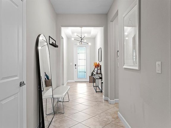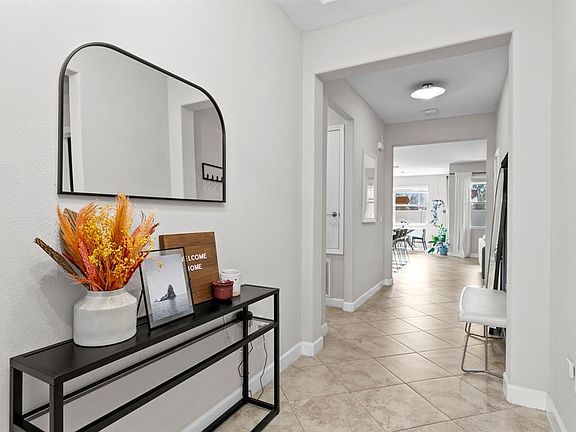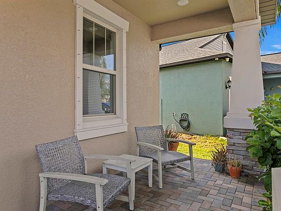 Welcome to this beautifully designed 3-bedroom, 2-bathroom home offering 1,732 square feet of thoughtfully curated living space. Built just six years ago, it still feels fresh, modern, and turnkey, perfect for anyone seeking style and comfort without the wait of new construction. The curb appeal is clean and elegant with manicured landscaping and a pavered driveway that sets a sophisticated tone from the moment you arrive. A beveled-glass front door opens into a welcoming foyer illuminated by a modern chic chandelier. Just off the entry, two secondary bedrooms share a full bathroom, offering privacy and convenience for guests, family, or a dedicated home office setup. The heart of the home is the expansive open family room, a bright and airy space designed for everyday living and effortless entertaining. The kitchen features granite countertops, a large island with breakfast-bar seating, a walk-in pantry, and GE stainless-steel appliances. The adjacent dinette overlooks the backyard, creating a cozy place for morning coffee or casual meals. The primary suite is located at the rear of the home for added privacy. Soft, plush carpet creates a warm and comfortable retreat, while the ensuite bathroom features dual sinks, a large soaking tub, a glass-enclosed shower, and a separate water closet. The oversized walk-in closet is thoughtfully connected directly to the laundry room, offering seamless daily convenience. Step outside to enjoy true Florida living with a covered and screened-in lanai that overlooks a deep, beautifully designed backyard. Pebbled and pavered walkways wind through a custom stone garden, creating a peaceful, zen-inspired outdoor oasis ready for your personal touch, whether that’s a fire pit, hammock area, or a thriving herb garden. This home blends comfort, elegance, and modern design in a prime location, offering a move-in-ready opportunity with room to grow both inside and out. With close proximity to well-regarded medical facilities, lifestyle amenities, and major commuter routes, this location blends comfort, convenience, and opportunity. Welcome Home!
