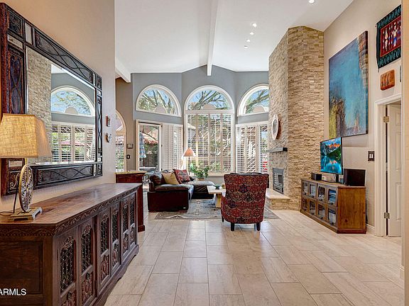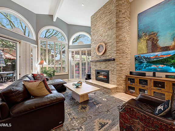 Beautifully maintained and thoughtfully upgraded, this residence in the desirable gated community of Hidden Lakes offers turnkey living surrounded by lush landscape and nearby Stonecreek Golf Course. Inside, the remodeled kitchen and baths (2013) feature quality cabinetry, stone countertops, designer tile, updated lighting, and modern fixtures. The living room showcases an electric fireplace with floor-to-ceiling stone, while matching stone details continue in the primary suite for a cohesive, high-end feel. Throughout the home, enjoy updated tile flooring (2018), energy-efficient Milgard windows and patio doors (2023-2024), and new can lighting in the main living areas. Major systems have been meticulously cared for, including a new HVAC system (2019, serviced 2025 with new motor. The community offers gated access, scenic walking paths, and proximity to shopping, dining, and recreationall in a prime Phoenix location.