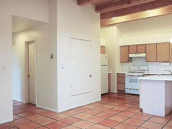 Unit D at 1144 Calle Amanda is 885 sq. ft., has heated tile floor in kitchen, living room, and 2 bathrooms. 2 bedrooms are carpeted. Open plan kitchen-living room has12 ft. beamed ceiling with skylight and a wood-burning fireplace. Refrigerator, gas range with oven, garbage disposal, dishwasher, closeted washer and dryer. Large storage closets throughout. Small patio is off the living room, locking metal screen door is at the front door. Private fenced yard with an additional storage unit. Off street parking for 2 cars. Long term quiet Spanish neighbors, and located close to Las Acequias park. No smoking inside the unit. No pets, but might be negotiable for this unit only. Tenant pays for all utilities. Rental cleaning deposit is same as one month's rent, and a detailed month to month rental agreement is required. No utilities are included. There are 2 dedicated off-street parking spaces. Rental agreement is one year on a month to month basis. Spanish neighbors.