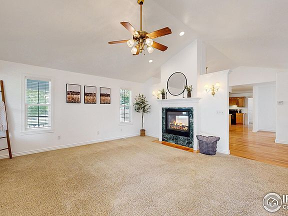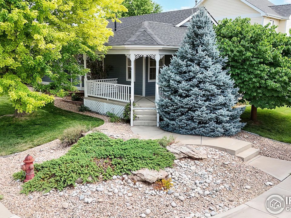 This charming 3-bedroom ranch-style home is nestled in the desirable Brunner Farm/New Windsor neighborhood and showcases exquisite craftsmanship throughout. Blending vintage elegance with modern potential, this home is truly a gem. Step onto the spacious wrap-around porch and into a bright and expansive living room, featuring a vaulted ceiling, a double-sided fireplace, and abundant natural light. The adjoining dining area, accented by a high ceiling, wood floors, and a bay window, offers the perfect setting for entertaining and large gatherings. The kitchen boasts solid wood cabinetry with glass-front doors, ample counter space, and a pantry. The home includes three generous bedrooms, including a spacious primary suite complete with a bay window, a 5-piece bath, and a walk-in closet. The convenience of main-level laundry is complemented by the opportunity for future expansion in the unfinished basement. Outdoors, enjoy the fully xeriscaped backyard with a brick courtyard, mature trees, and shrubs. Additional features include an oversized two-car garage and a new roof. Conveniently located close to all the amenities this wonderful community offers!
