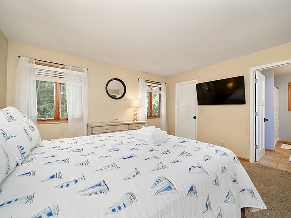 The open kitchen and dining layout makes gathering easy, while a mudroom with washer and dryer keeps life organized after lake days. The spacious primary suite includes a private bath and cozy seating area.