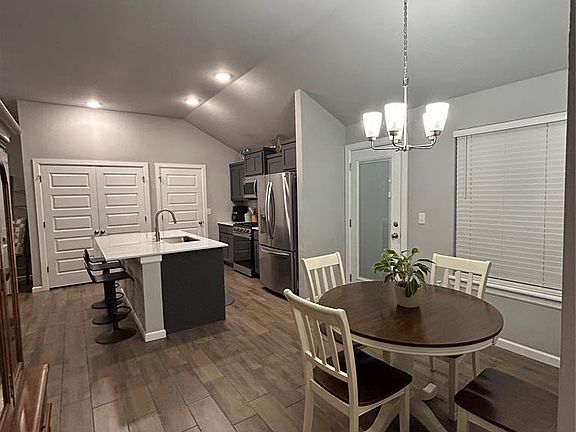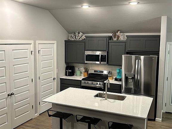 Basketball areaCeramic wood look tileStainless steel appliancesSplash padElevated ceilings