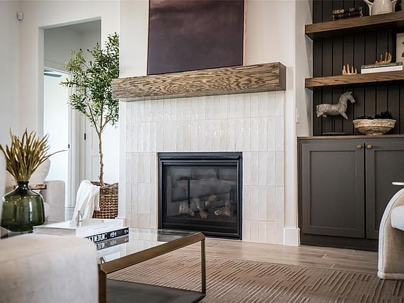Oklahoma sunsetsWarm elegantly modern stylePocket doorWalk thru closetWood look tileGas fireplaceVaulted beamed ceiling