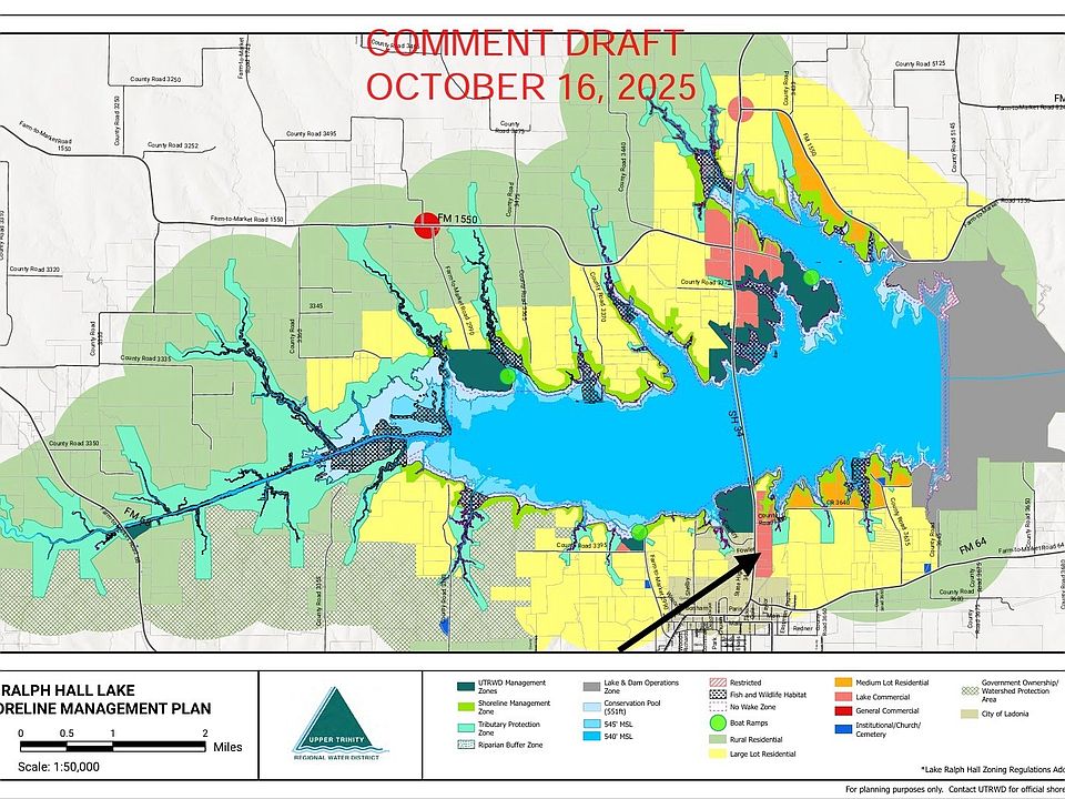 Property proposed zoning is Lake Commercial with potential Lake access from the back, almost 600 feet frontage on Hwy 34, good for any kind of business or lake mix properties. No zoning Restrictions, probably last Property with proper access before future bridge over Lake Ralph Hall entrance on Hwy 34. The new bridge over Lake Ralph Hall isn't just for motorized vehicles, visitors will be able to directly stroll over the lake using the bridge's 10-foot pedestrian walkway, the walkway will connect to the lake's administration facility, visitor center and other trails in the Ladonia area for activities like hiking and bicycling. Draft of Upper Trinity Water District of Lake Ralph Hall and Lake & Shoreline Management Plan from Oct 16, 2025, can be found on: Google or