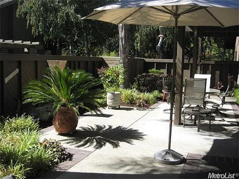 TURN KEY, READY TO MOVE RIGHT IN. Updated modern kitchen with custom cabinetry, beautiful granite, built-in refrigerator. Expansive garden window looks out to the inviting patio/yard. Additional atrium patio off kitchen and secondary bedroom. Extensive tile flooring, carpet only 6 months old. Plantation shutters. Easy low maintenance yard with covered patio, custom concrete and water feature. Newer roll-up garage door.